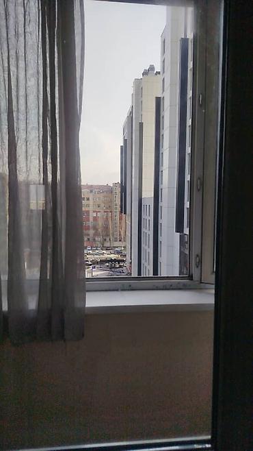 - Просторная жилая комната с большим панорамным окном и видом на город; плотные шторы.