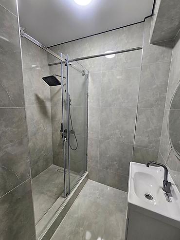 - Ванная/душевая: большая душевая зона с раздвижными стеклянными перегородками и тропическим душем, умывальник с тумбой, зеркалом и смесителем; стены и пол — керамогранит.