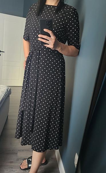 Платье миди с принтом в зелёно‑синих тонах на чёрном фоне. Приталенный силуэт с расклёшённой юбкой, застёжка на пуговицы спереди. Длинные рукава с лёгким расклёшем к манжетам. Контрастный воротник ...