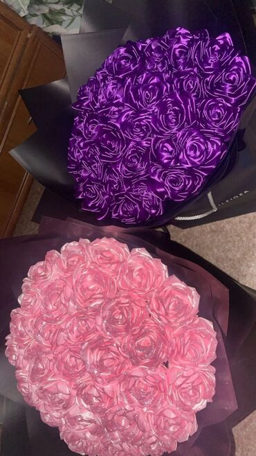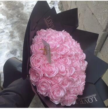 .Атлас лентасынан жасалган роза букеттери 🌹 Колдон жасалган (ручная работа), сапаттуу атлас лентадан. Солбойт, узакка сакталат, өзгөчө белек 🎁 Түстөрү: кызгылт, көгүш (каалоого жараша жасайм) Баасы...