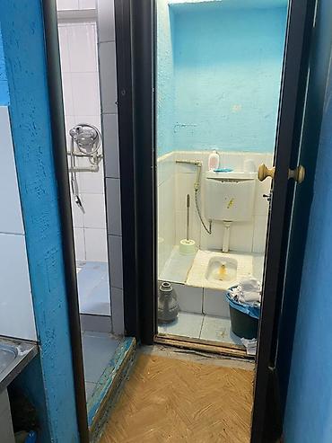 - Санузел раздельный: душ с ручной лейкой в плитке и отдельный туалет азиатского типа со сливным бачком; есть ведро/урна и полка для принадлежностей.