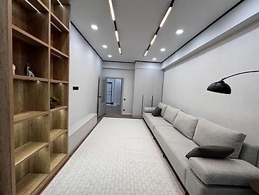 - Современная планировка: просторная гостиная с большим модульным диваном, встроенным стеллажом с подсветкой и потолочными трековыми светильниками.