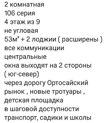 Продаётся 2 комнатная квартира. 📍 Адрес: 8мкр по Южной Магистрали 👷♂️ Застройщик: Квартира не угловая, 2 расширенные лоджии На 2 этаже из 4 Хорошее расположение дома. Чистый подъезд, спокойные ...