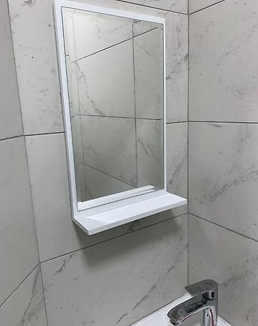 - Санузел с современной плиткой, зеркальным шкафчиком/полкой над раковиной и смесителем.