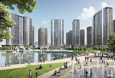 - Большой благоустроенный парк в центре проекта: пешеходные бульвары, набережные, амфитеатр, детские зоны, площади с сухими фонтанами.