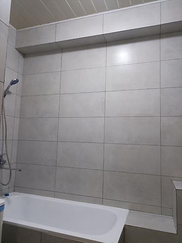 - Ванная комната с прямоугольной ванной, душевая лейка на штанге, стены полностью в крупноформатной светло‑серой плитке, ниша-полка из плитки.