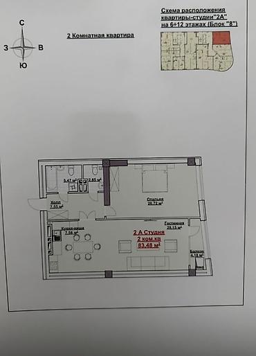 Двухкомнатная квартира-студия общая площадь 83,48 м², в современном многофункциональном комплексе.