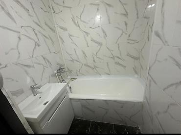 - Раздельный санузел: туалет с раковиной и настенной плиткой; ванная комната в плитке под мрамор, ванна стандартного размера, умывальник с тумбой и смесителем.
