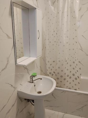 - Санузел с ванной: кафель «под мрамор», раковина на пьедестале, зеркало‑шкаф с полками, штора для ванны.