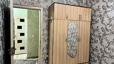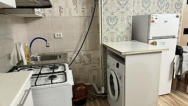 Предлагается к аренде или продаже квартира, включающая кухню и жилые комнаты. Кухня оборудована газовой плитой с четырьмя конфорками и духовым шкафом, раковиной со смесителем, стиральной машиной и холодильником. Кухонный гарнитур выполнен в светлых тонах, с навесными шкафами со стеклянными дверцами и вытяжкой. В жилой комнате установлен платяной шкаф с зеркальной вставкой и кровать, а также имеется окно с занавесками и люстра на потолке. Полы в квартире выполнены из ламината, стены оклеены обоями с узором. Общее состояние квартиры аккуратное и ухоженное.