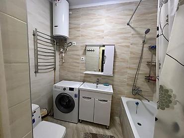 - Санузел совмещенный: ванна с душем, раковина с тумбой и зеркальным шкафчиком, унитаз, полотенцесушитель, водонагреватель и стиральная машина.