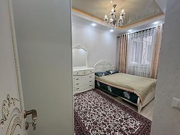 - Спальня с двуспальной кроватью, прикроватной тумбой и комодом с зеркалом; потолок с подсветкой и люстрой.
