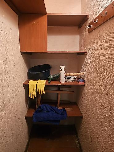 - В одной комнате угловой шкаф-купе с зеркальной створкой и открытыми полками; письменный/журнальный стол.