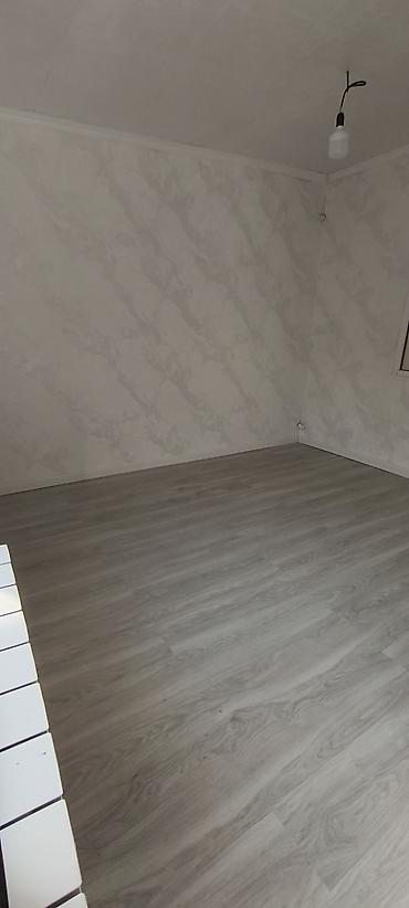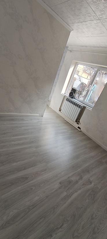 - Комната 2: просторная, с большим окном и радиатором; на полу ламинат/ПВХ-покрытие серого оттенка, стены в светлых тонах.