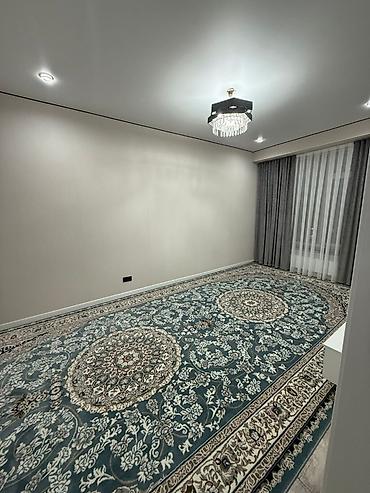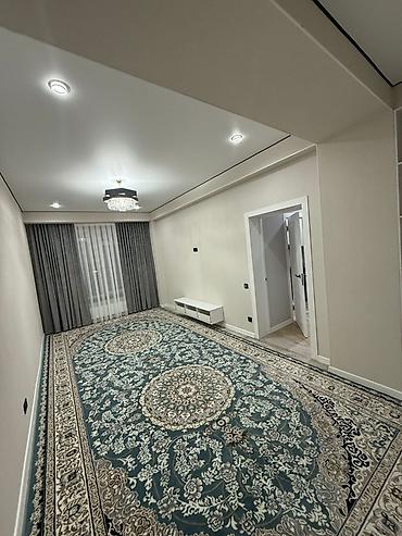 - Просторная гостиная с натяжным потолком, точечным освещением и люстрой; большие окна с плотными шторами. На полу — большой узорный ковёр, настенная ТВ‑тумба.