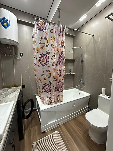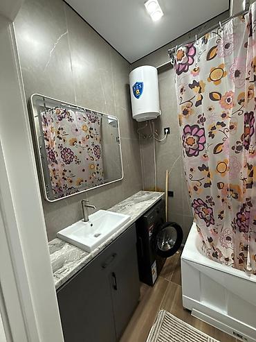 - Санузел совмещённый: ванна со шторкой, умывальник на тумбе с мраморной столешницей, большое зеркало, водонагреватель накопительный, стиральная машина с фронтальной загрузкой.