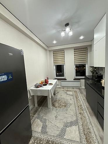 - Кухня линейной планировки: верхние и нижние шкафы, чёрная столешница, варочная панель, вытяжка, мойка, холодильник Beko. Два окна с рулонными шторами, радиатор отопления.