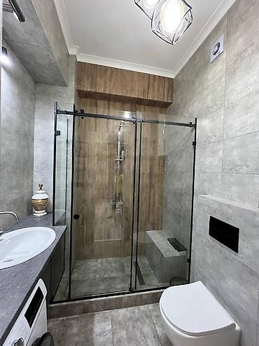 - Санузел: душевой бокс с раздвижными стеклянными дверями и встроенной скамьей, инсталляция унитаза, умывальник с тумбой и широкая столешница, стиральная машина, плитка под камень и дерево, точечное и декоративное освещение.