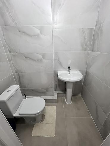 - Санузел раздельный: туалетная комната с унитазом и раковиной; ванная комната с ванной, душем, раковиной на пьедестале, полотенцесушителем и стиральной машиной. Керамическая плитка на стенах и полу в едином светло‑сером тоне.