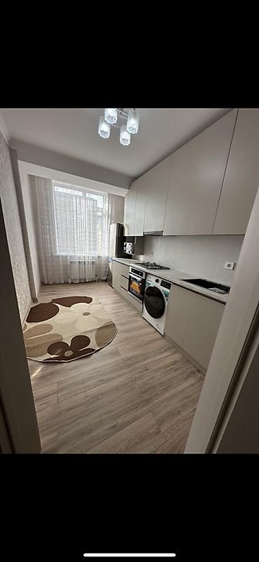 - Просторная светлая кухня с линейным гарнитуром до потолка, встроенной варочной поверхностью, духовым шкафом, вытяжкой, микроволновкой, холодильником и стиральной машиной. Рабочая поверхность и фартук выполнены в едином светлом тоне, есть розетки над столешницей.