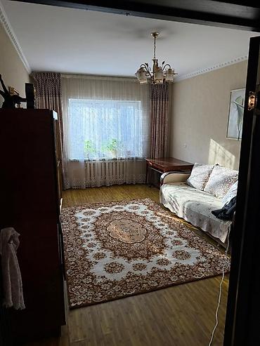 - В гостиной диван, ковёр, шкаф/сервант, потолочная люстра, шторы и тюль.