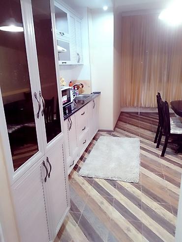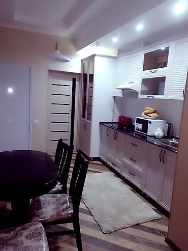 - Отдельная кухня‑столовая: длинная рабочая поверхность, мойка, вытяжка, микроволновая печь, электрический чайник, навесные и напольные шкафы с большим количеством мест для хранения; обеденная зона с круглым столом и стульями. Напольная плитка «ёлочкой», подсветка.