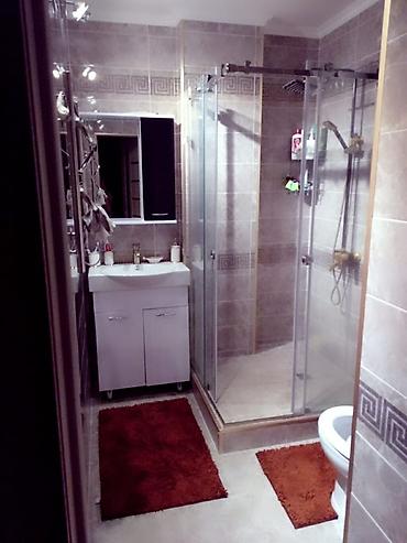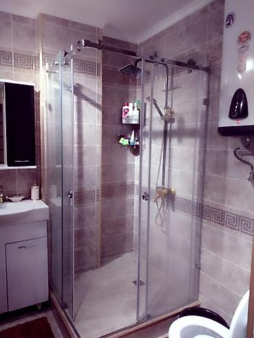 - Санузел с душевой кабиной из стекла, верхний тропический душ, раковина с тумбой, водонагреватель.