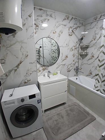 - Санузел с керамической плиткой «под мрамор», унитазом, тумбой с умывальником и зеркалом.
