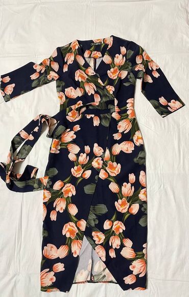 Платье вечернее, миди, серо‑стального оттенка. - Силуэт: приталенный верх и расклешённая юбка миди с мягкими складками. - Лиф: запах с драпировкой, V‑образное декольте, широкие отложные плечевые «...