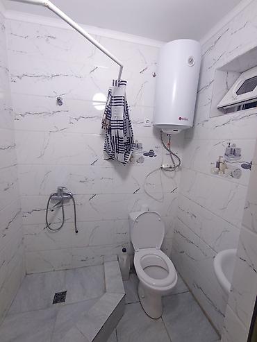 - Санузел: душевая зона с трапом, унитаз, умывальник, бойлер для горячей воды; керамическая плитка на стенах и полу.