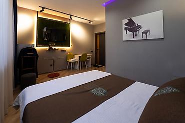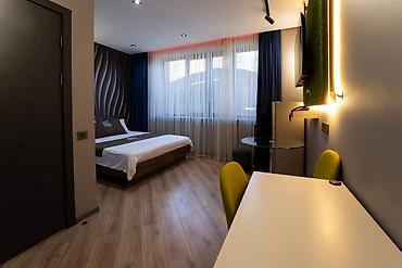- Планировка: спальня с двуспальной кроватью, рабочая зона с письменным столом и двумя стульями, компактная обеденная зона с круглым столиком, тумба/комод.