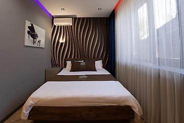 - Дизайн: акцентная 3D‑стена с волнистым рельефом, натяжные потолки с точечным и неоновым RGB‑подсветом, большие панорамные окна с плотными шторами и тюлем, тёплые оттенки дерева на полу и мебели.