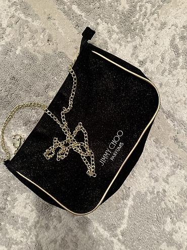 3) Бархатный клатч-конверт Jimmy Choo Parfums (логотип на лицевой стороне). Черный бархат с легким шиммером, контрастная окантовка по краю, тонкая металлическая цепочка-ремешок золотистого цвета.