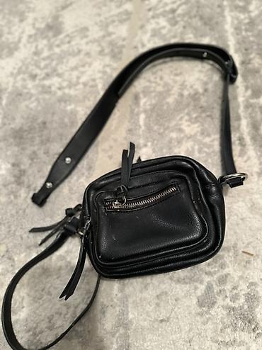 2) Компактная кросс-боди/бананка из черной гладкой кожи. Два основных отделения на молнии, внешний карман на молнии спереди, кожаные язычки на бегунках. Регулируемый длинный ремень с люверсами, металлические полукольца для крепления.