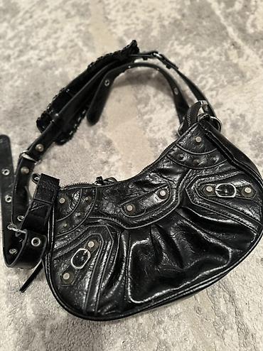 1) Сумка-хобо из черной фактурной кожи с металлическими заклепками и декоративной фурнитурой. Полукруглая форма, складки по корпусу. Верхняя молния, широкий ремень с отверстиями и пряжками, карабины. Подходит для ношения на плече.