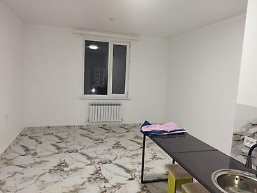 - Просторная комната с окном ПВХ и батареей отопления, белые стены, пол — керамогранит под мрамор по всей площади.