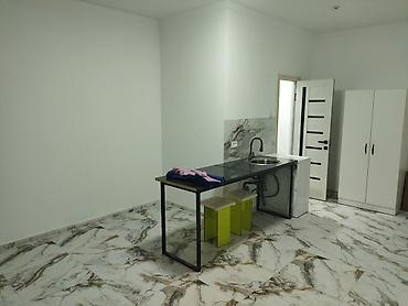 - Кухонная зона: столешница из темного камня/ДСП, круглая мойка с высоким изливом, фартук с мраморным рисунком, розетки над рабочей поверхностью, барная стойка/рабочий стол на металлических опорах, два табурета.