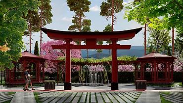 - Благоустроенный двор в японском стиле: прогулочные аллеи, зоны отдыха, беседки, декоративный фонтан и ландшафтный дизайн