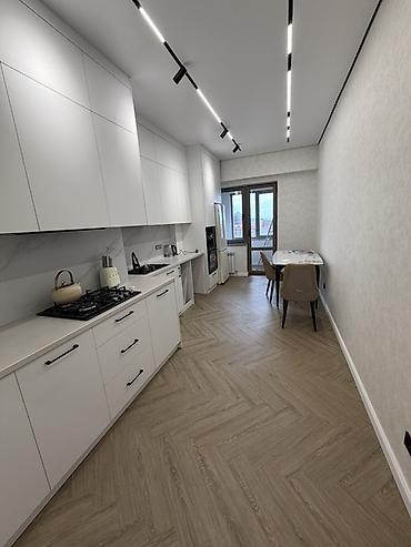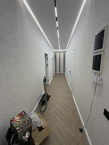 - Отделка и материалы: единый напольный покрытие под дерево «ёлочка», стены в светлых тонах, натяжные потолки с контурной LED‑подсветкой.