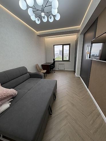 - Планировка: отдельная спальня с большой кроватью и высоким мягким изголовьем, гостиная с диваном и креслом, кабинет/вторая комната с рабочей зоной и раскладным диваном, санузел с ванной.