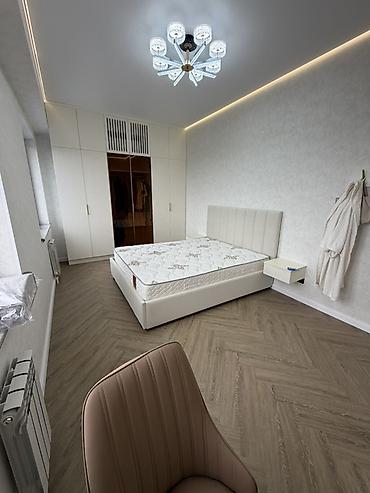 - Спальня: вместительный шкаф-купе до потолка с акуратными фасадами, прикроватная тумба, матрас на кровати.
