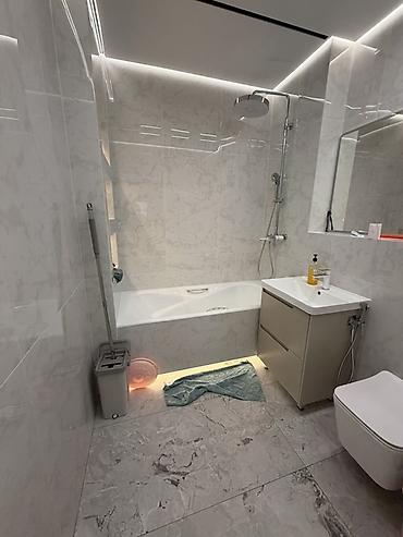 - Освещение: несколько центральных люстр в современном стиле, подсветка по периметру потолка, настенные бра в гостиной, подсветка зоны ванны и тумбы.