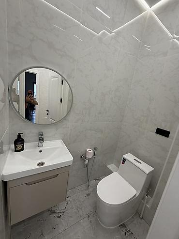 - Ванная: облицовка керамогранитом «под мрамор», ванна с душевой стойкой «тропический душ», подвесной унитаз, тумба с раковиной и выдвижными ящиками.