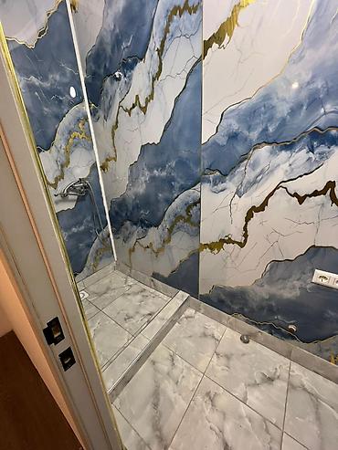 - Крупноформатные глянцевые плиты с мраморным рисунком (белый/синий/золотистый)