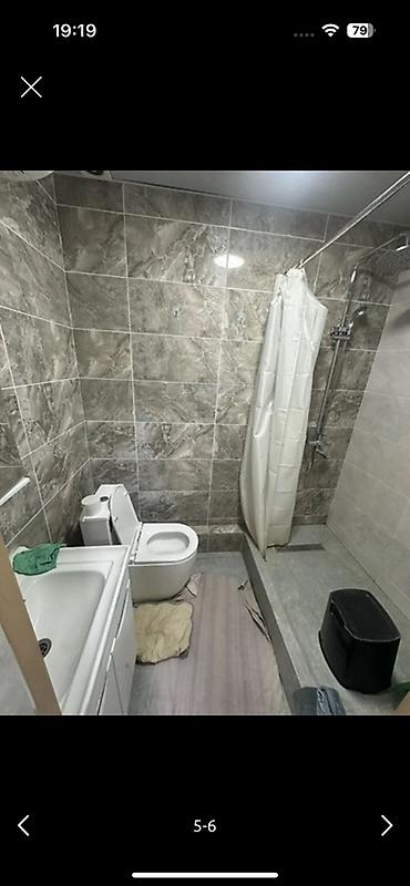- Санузел совмещённый: унитаз, раковина с тумбой, душевая зона с поддоном и шторкой, плитка на стенах и полу