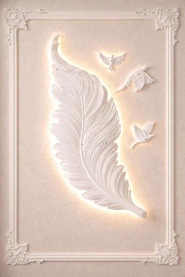 - Декоративные гипсовые панно и барельефы в классическом стиле: рамки, карнизы, флоральные композиции, перо с птицами, изящные орнаменты.