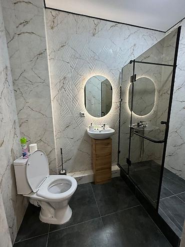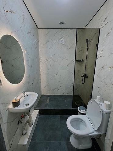 - Просторная ванная комната: душ в стеклянной кабине с тропическим лейкой, умывальник на тумбе, зеркало с подсветкой, унитаз, базовые туалетные принадлежности.