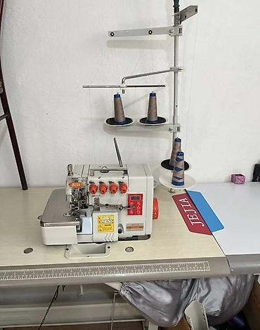 Промышленный оверлок JASEW на столе с подставкой под нити и ножной педалью. - Тип: 4‑ниточный/3‑ниточный оверлок для стачивания и обметки краев трикотажа и тканей средней толщины - Электронная пан...