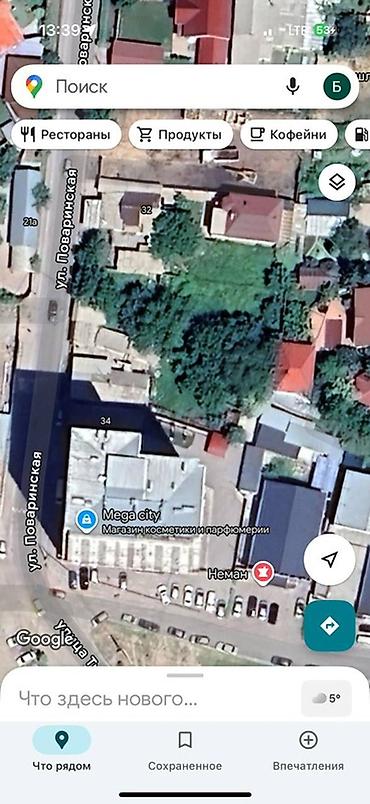 Земельный участок на ул. Поваринская (ориентир — ТЦ/магазин Mega City, «Неман»). Участок выделен на спутниковой схеме красным контуром, имеет нестандартную форму с выходом к isпроезжей части ул. Поваринская и подъездом со двора. Окружение — жилая застройка и коммерческие объекты, активный пешеходный и автомобильный трафик.