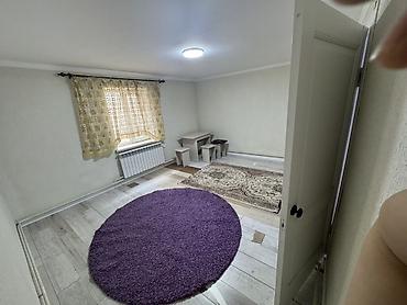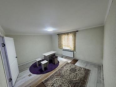 - Комната с окном, радиатором отопления, потолочным освещением. На полу ламинат, два ковра, небольшой стол и табуреты.